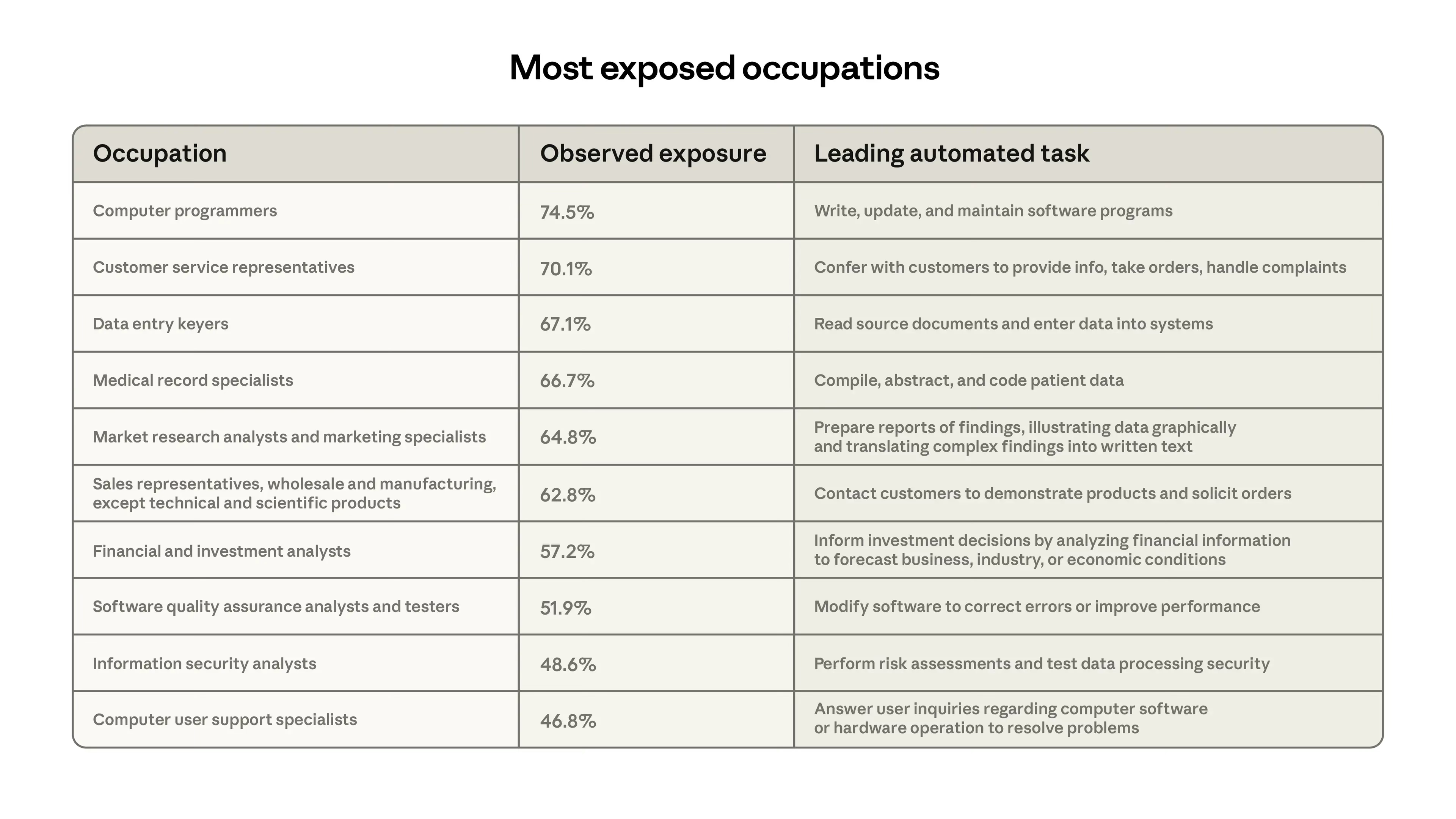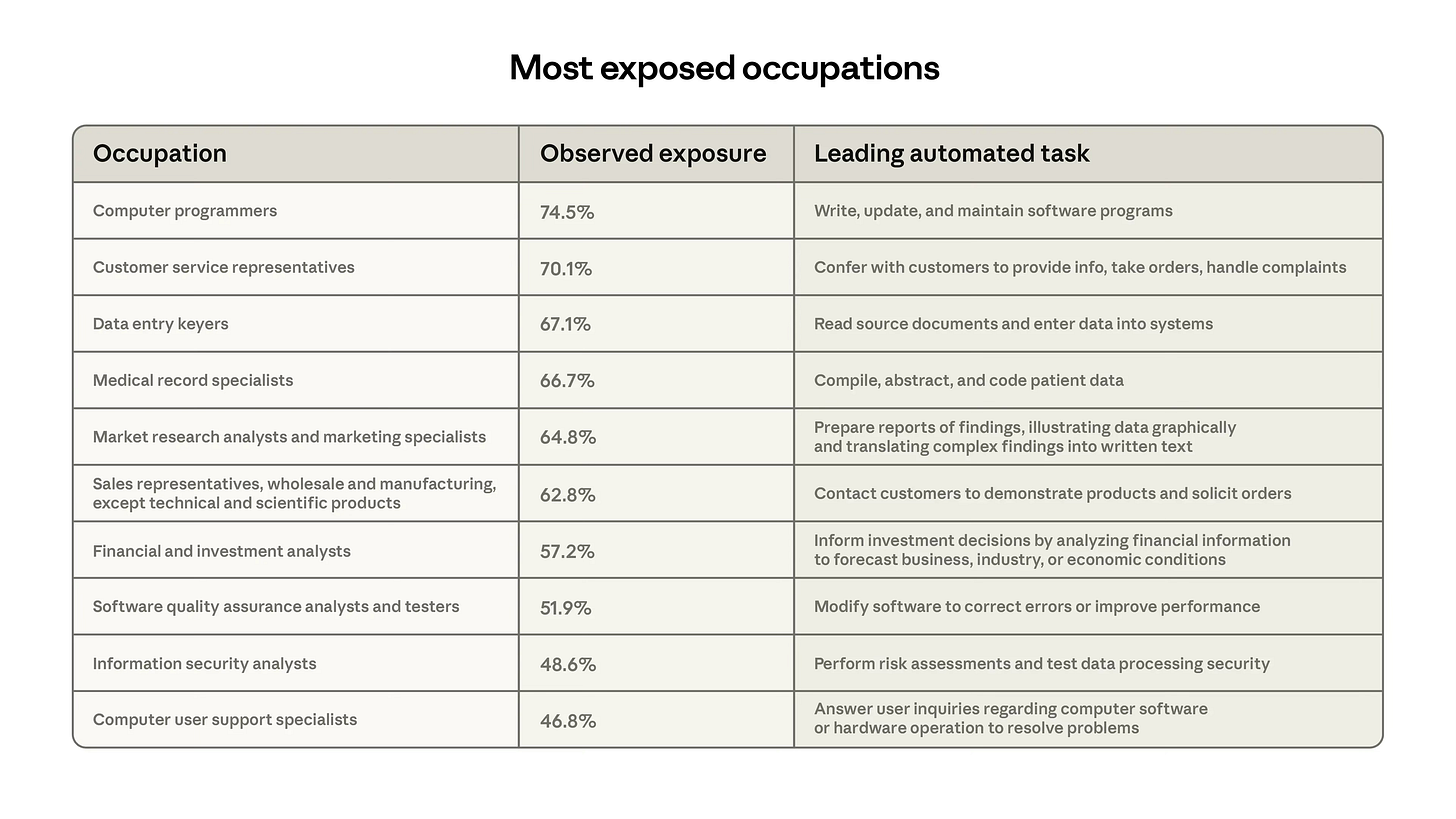 I like Steven. I admire him as a media entrepreneur. I’ve also spent years looking at charts like these in company pitch decks. This graph is a total addressable market (TAM) slide. It’s important we see that for exactly what it is… a marketing tool. Anthropic sells AI tools and is publishing research about how much more of its product the economy could potentially buy. Buyers being both enterprise and consumer. Anthropic’s own reporting highlights computer programming work as the most exposed occupation with 75% automation coverage.