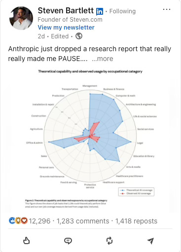 It was published by Anthropic this week in their latest labor market impact report. Anthropic makes Claude. Claude is an LLM. I use Claude daily. Steven Bartlett shared the same graphic to his millions of LinkedIn followers and it’s already one of his highest engaged posts of 2026 which tells us just how frothy the hype is surrounding the “AI will replace jobs” narrative right now.
